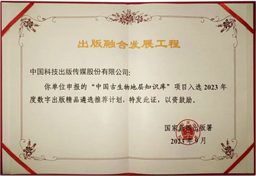 2023918日,国家新闻出版署发布《国家新闻出版署关于公布2023年度出版融合发展工程入选名单的通知》,“中国古生物地层知识库”入选2023年度数字出版精品遴选推荐计划。