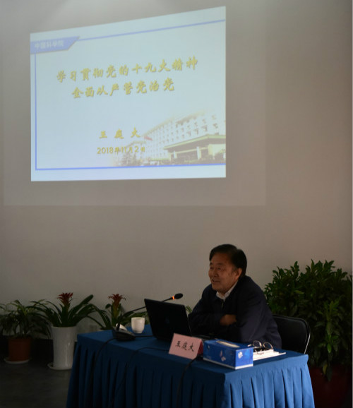 中央纪委驻院纪检组原组长王庭大书记做了《学习贯彻党的十九大精神,全面从严管党治党》的辅导报告。王书记结合中央党的十九大精神,从关于马克思主义的党、全面从严治党、新时代党建的要求三方面阐述了全面从严治党的理论和实践。