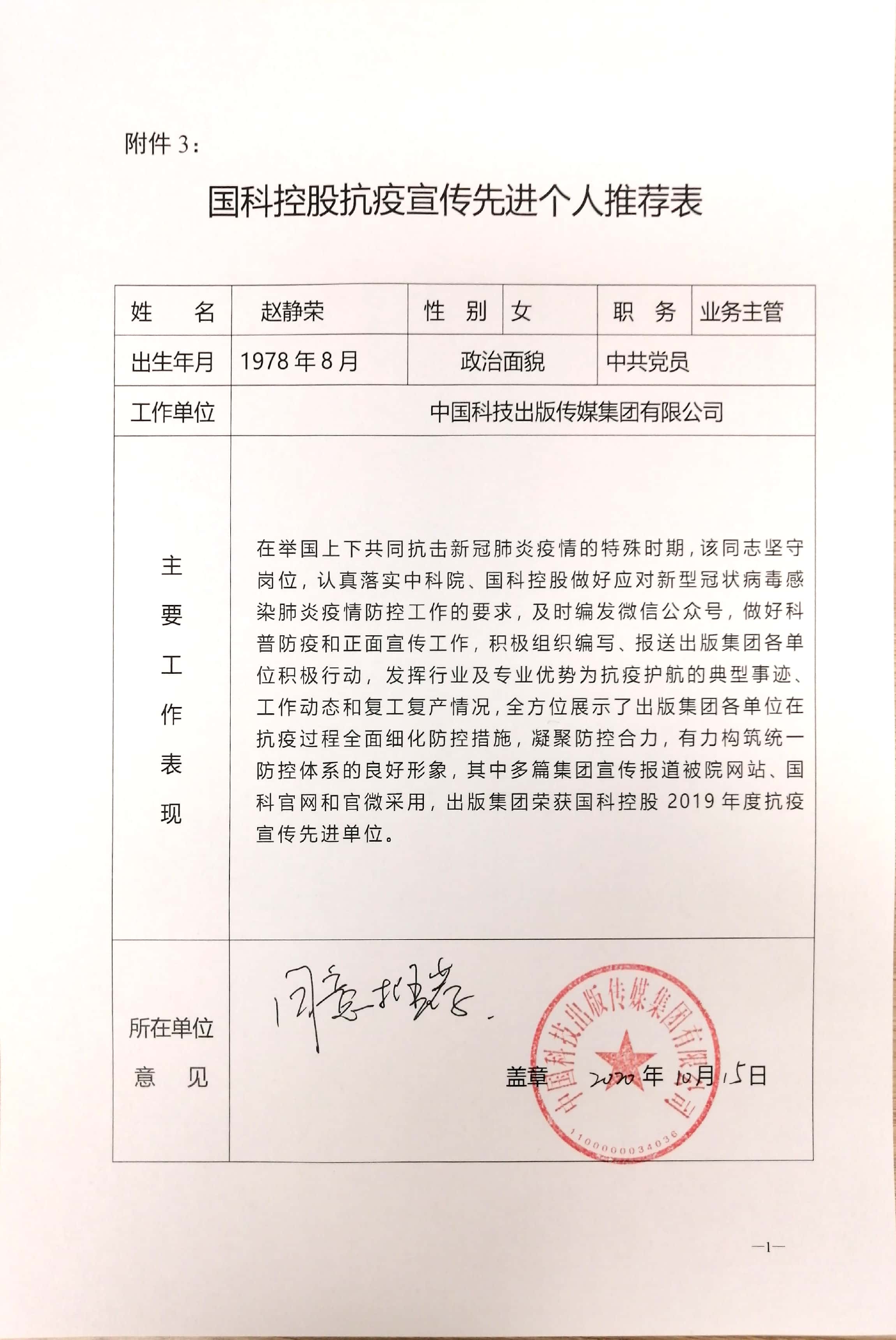 根据《中国科学院控股有限公司 关于推荐国科控股2019年度信息宣传先进个人和抗疫宣传先进个人的通知》,经出版集团研究决定,拟推荐赵静荣同志申报抗疫宣传先进个人。现将其相关材料进行公示,如有异议,请在公示期间向集团办公室反映。